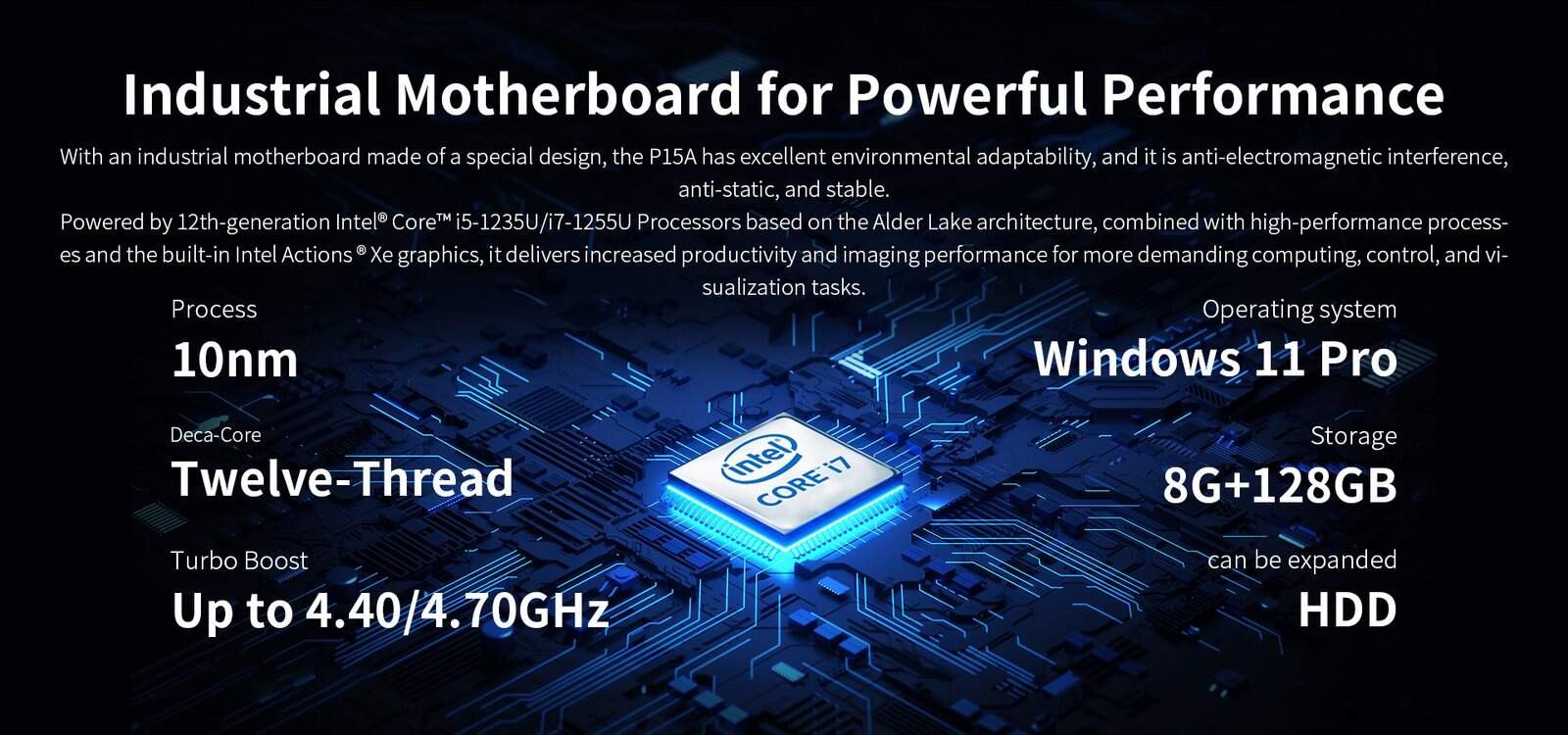 The EM-P15A is an industrial powerhouse crafted to handle your most challenging computing and visualization requirements. At its core is the cutting-edge 12th Gen Intel® Core™ i5 processor, delivering exceptional speed and reliability to ensure smooth operation, even under heavy workloads. Coupled with Iris® Xe graphics, this device exhibits remarkable performance in rendering complex data and advanced HMIs (Human-Machine Interfaces) with clarity and precision.