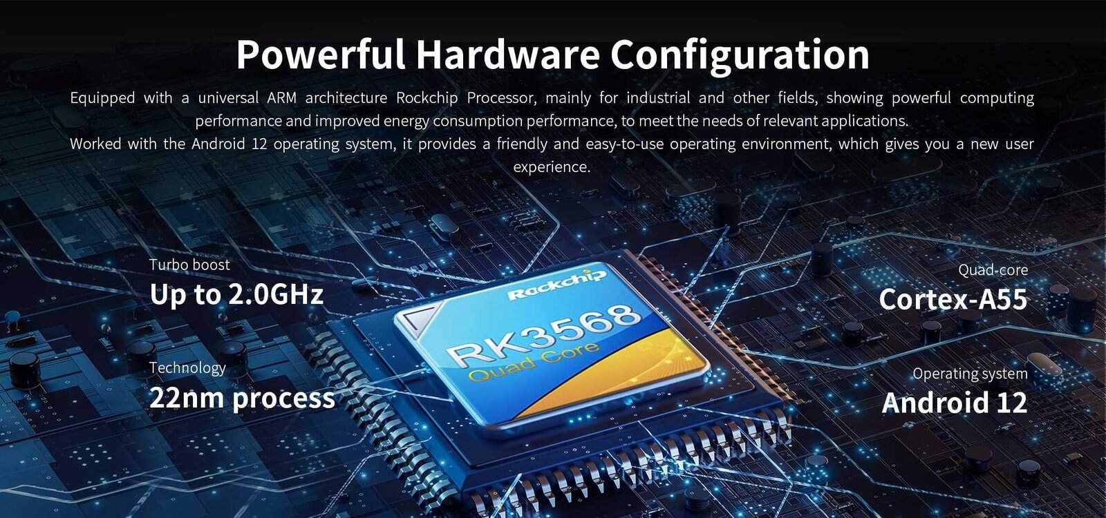Robust Processing: Rockchip RK3568 (quad-core Cortex-A55, up to 2.0GHz, 22nm) with Mali-G52-2EE GPU ensures efficient computing for industrial applications.